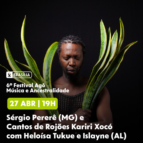 Festival Agô traz artistas indígenas, negros e africanos para CAIXA Cultural, em Brasília Shows, oficina e rodas de conversa serão realizados de 24 a 27 de abril, com nomes como: Cátia de França, Gean Ramos Pankararu, Ponto Br, Povo Fulni-ô e Sérgio Pererê. O nigeriano Ìdòwù Akìnrúlí e o moçambicano Otis Selimane também marcam presença. Dia 27 (domingo) 19h Sérgio Pererê (MG) e Cantos de Rojões Kariri Xocó com Heloísa Tukue e Islayne (AL)
